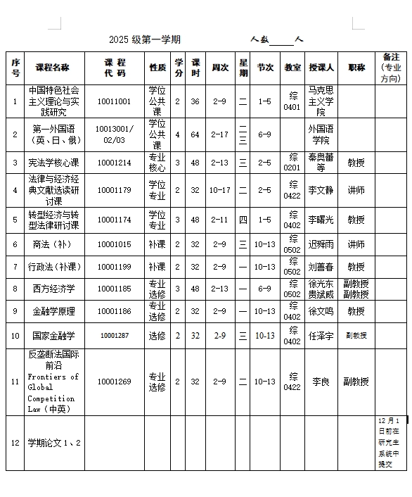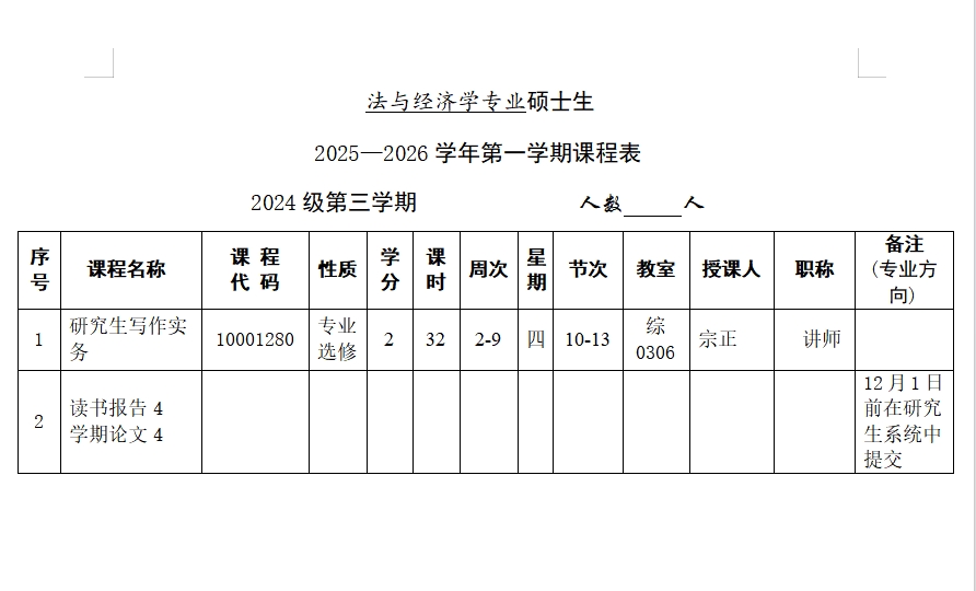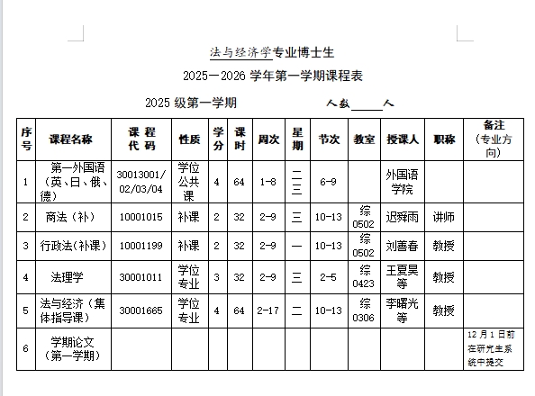 法与经济学研究院2025-2026学年第一学期研究生课表